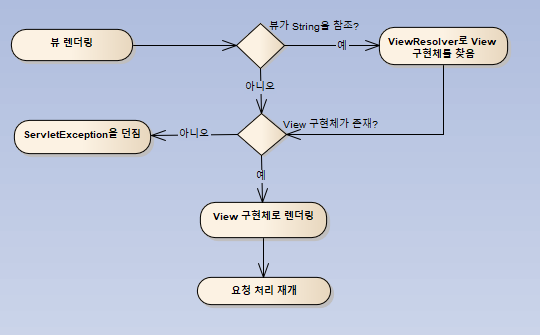 뷰 렌더링 요청이 왔을 때 뷰가 String이라면 ViewResolver의 구현체를 찾지 못했다면 ServletExcption을 발생시킨다.